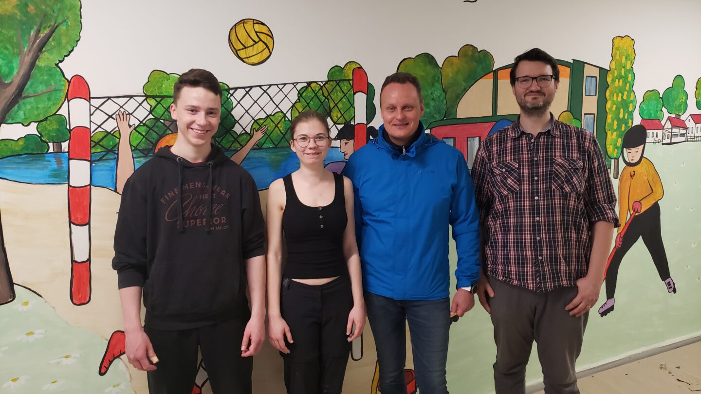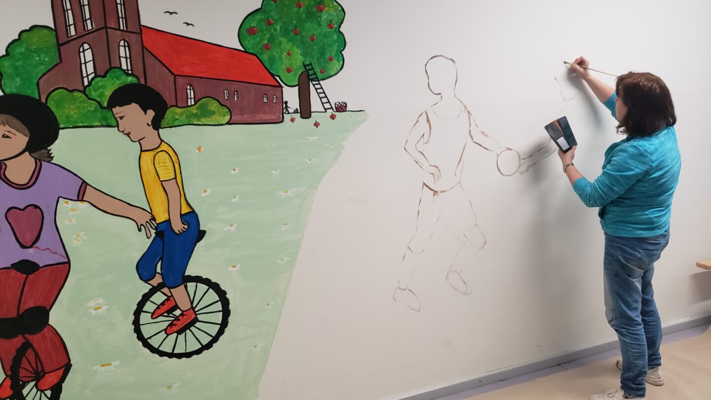 Wir werden weiter malen. Noch weitere 3 Ferienwochen hat der Projektgeber genehmigt. Und die Kinder freuen sich schon. Haben Sie doch noch so viele Ideen für die weiteren Wände in der Turnhalle: Fußball muss mit drauf, und ein Drachenboot, ein Taucher, Staffelläufer, Maskottchen von Sportvereinen, ein Heißluftballon, Vogelnester, ein Baumhaus….und-und-und.“